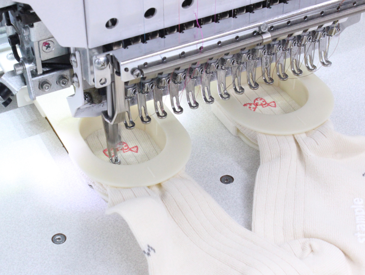 複数ある単頭機では、みつばリーフやお守り袋専門店みつばのアイテムも、1つずつお名前やメッセージ刺繍をお入れします。 1分間に900回転以上の高速で綺麗に刺繍することが可能で、製品枠や帽子枠、靴下枠も取り付けられるので、あらゆる刺繍加工に対応できます。