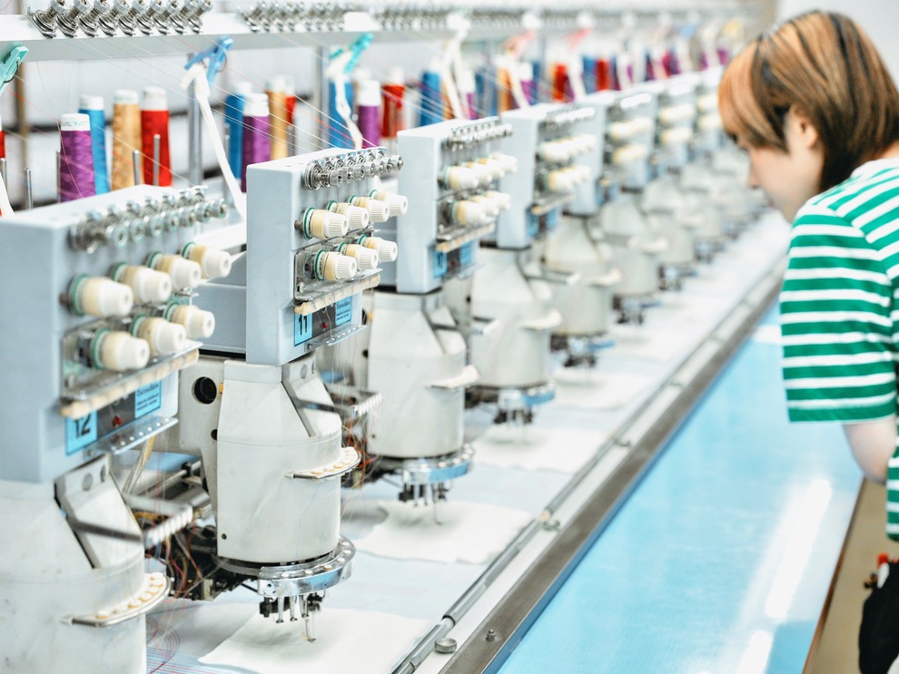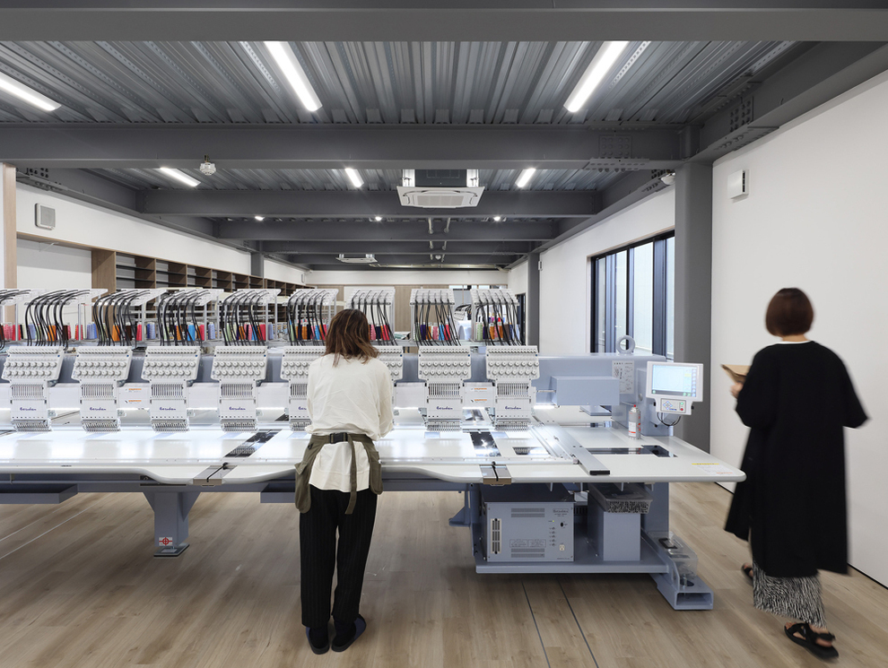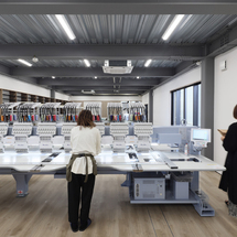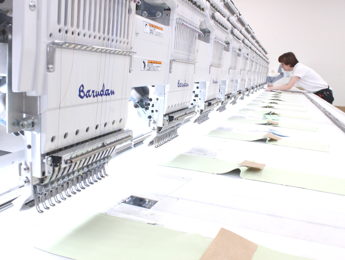 刺繍機15台(多頭式ジャガード刺繍機9台、単頭式ジャガード刺繍機6台)/アイロンプレス機/打ち抜きポンス/ラインストーン接着機/刺繍データ作成CAD/本縫いミシン/ ロックミシン/横振りミシン