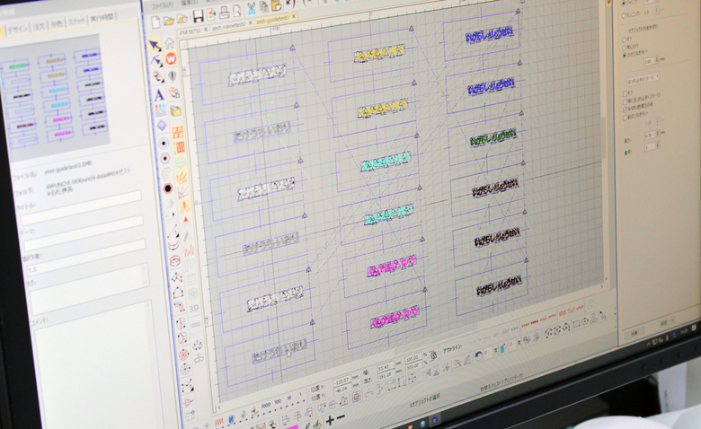 を確認。ご希望があれば、この段階で試打ちサンプルを画像でご確認いただけます。そのうえで必要に応じて刺繍データの修正、配色の変更を行い、ご希望通りの刺繍に仕上げていきます。