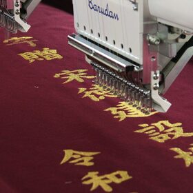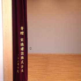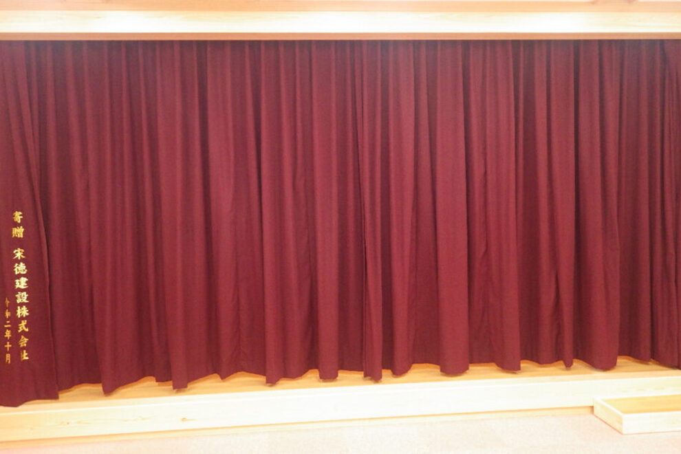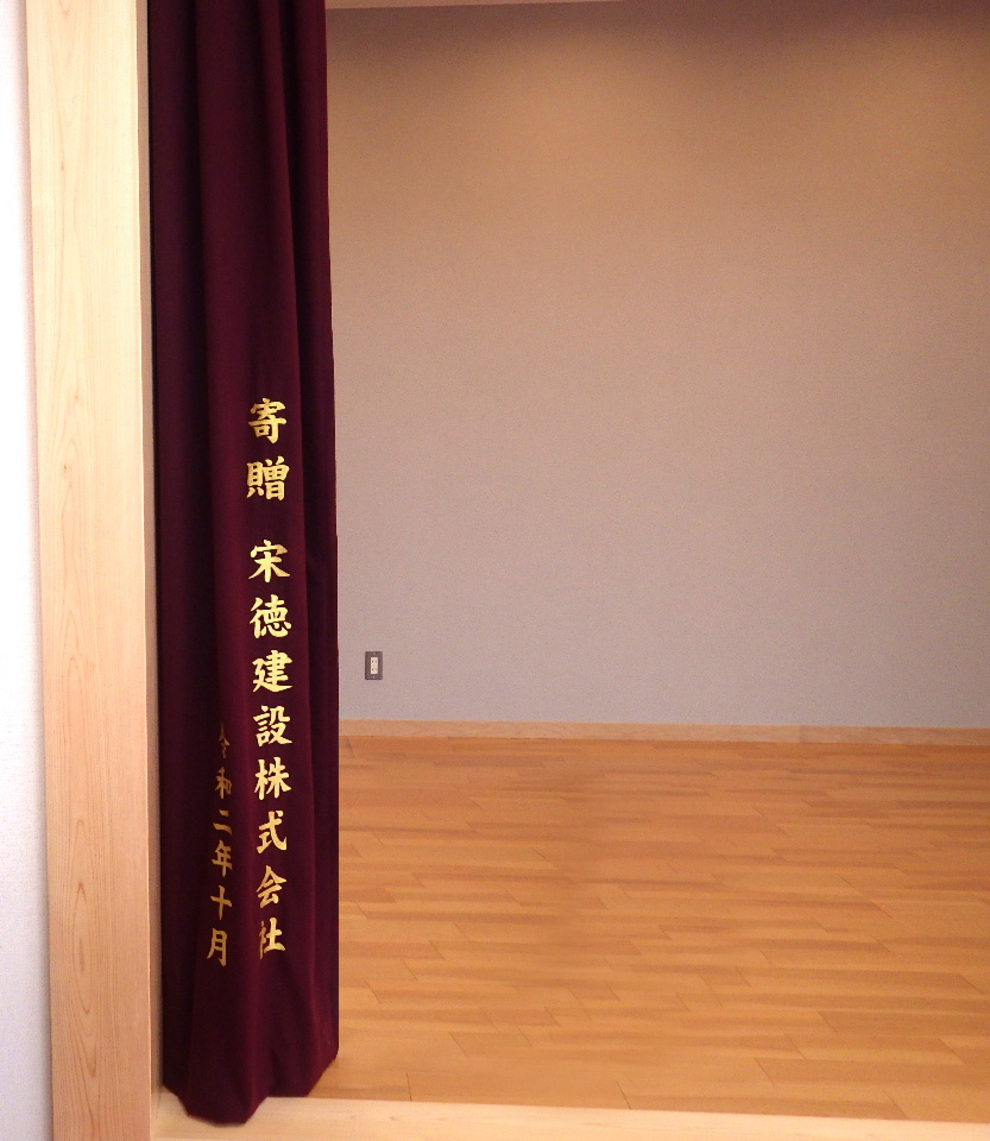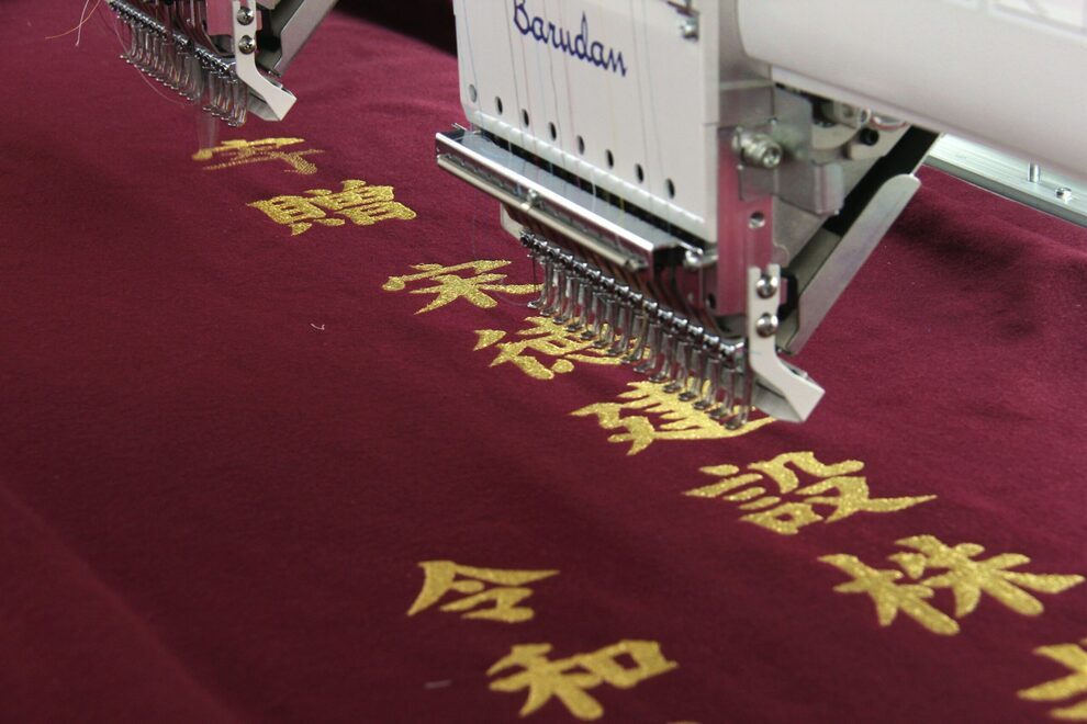 京都府宮津市にある、宋徳建設株式会社様よりご依頼を頂きました。 宋徳建設様はいつも作業着へのネーム入れの加工をさせて頂いておりましたが、 こんな舞台幕に刺繍は入れれますか?とお問い合わせ頂きました。 写真3枚目のように、量産ミシンで頭ごとに刺繍する文字を分けて 大きな舞台幕へ刺繍させて頂きました。